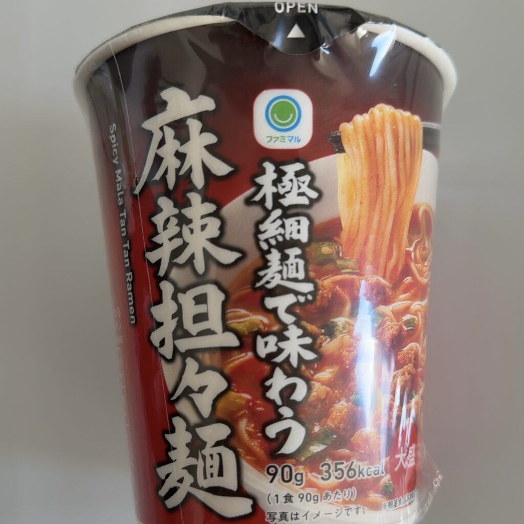 ファミリーマートのカップ麺で、つるっとしたノンフライの極細麺と、練りごまと花椒の香りが立つ本格的な麻辣担々スープ。