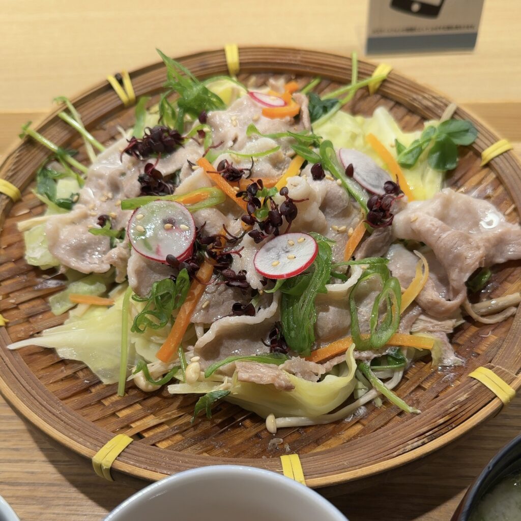 今回は、仕事帰りにいただいた「彩り野菜と豚ざる蒸し」を中心に、メニューの印象やお店の雰囲気をお伝えします。