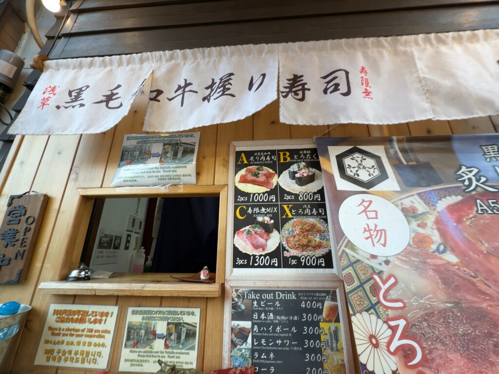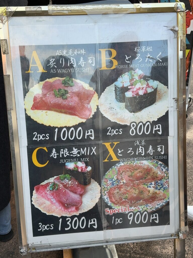 メンチカツやおだんごといった定番グルメはもちろん、ちょっと贅沢な肉寿司まで、幅広い楽しみ方ができるのが浅草ならではです。