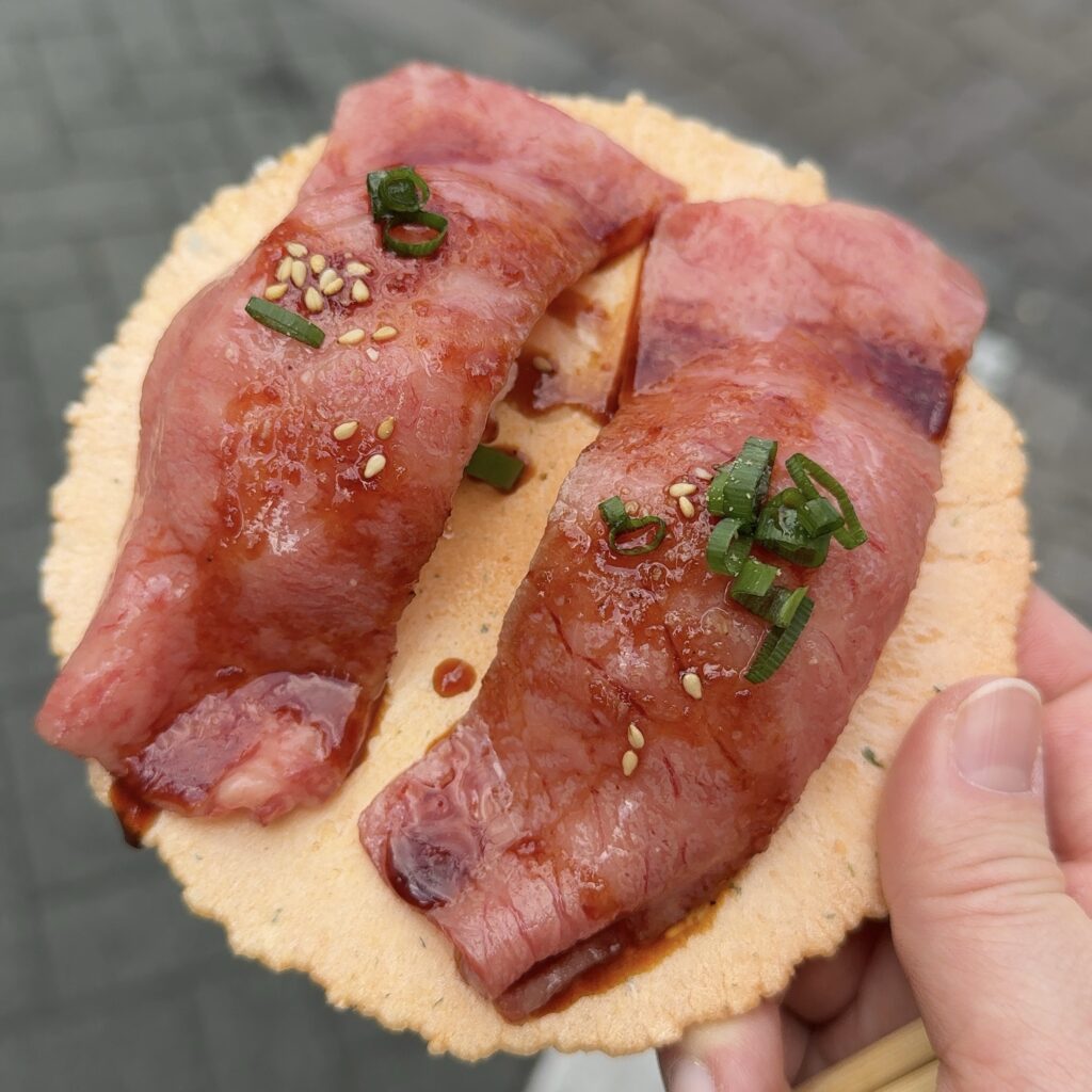 ホッピー通りを歩いていると目に留まったのが、こちらの肉寿司です。