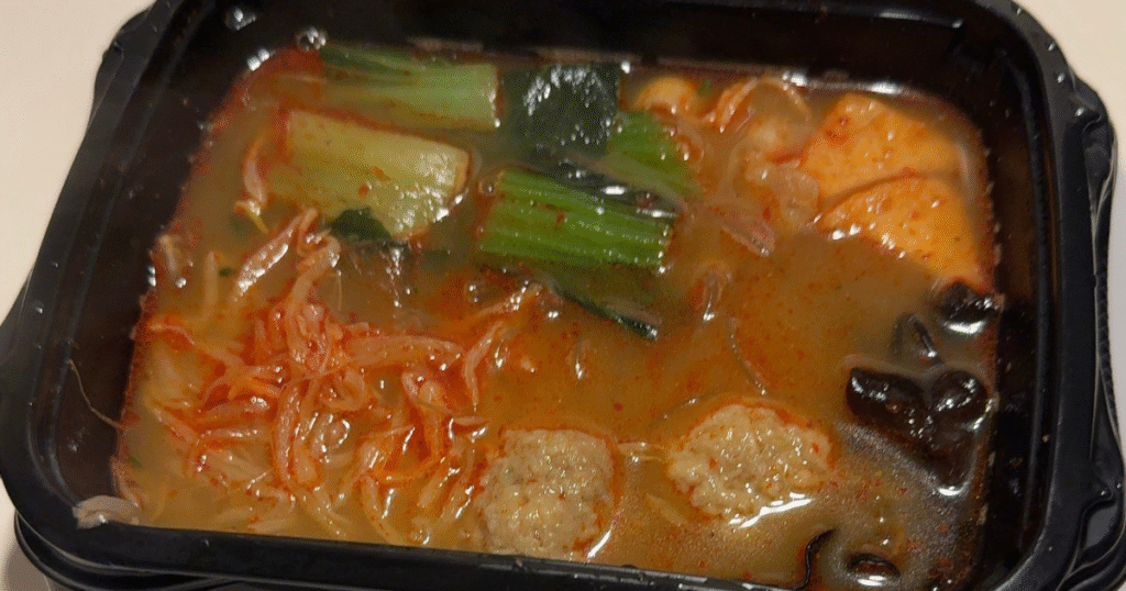 具材は、もやし、チンゲン菜、黒きくらげ、肉団子、厚揚げ、豚ばら肉と追加トッピングをしなくても十分。