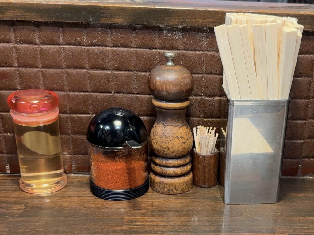 卓上にはお酢・唐辛子・胡椒が置かれていて、お好みで味変も楽しめます。