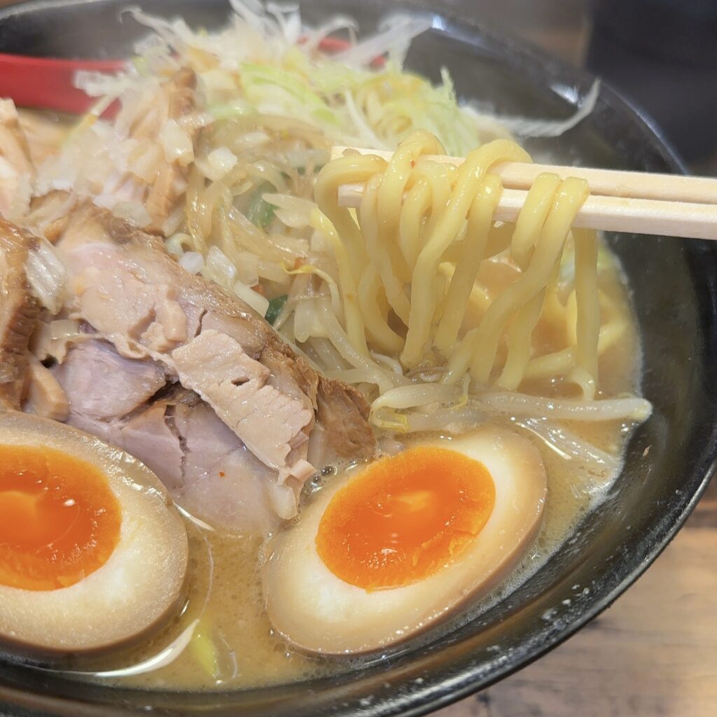 濃厚な味噌スープが太麺としっかり絡んで、一口ごとに旨みが押し寄せてくるような力強さ。
