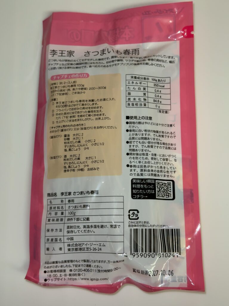 原料はさつまいものでんぷんで、もちっとした弾力が特徴です。