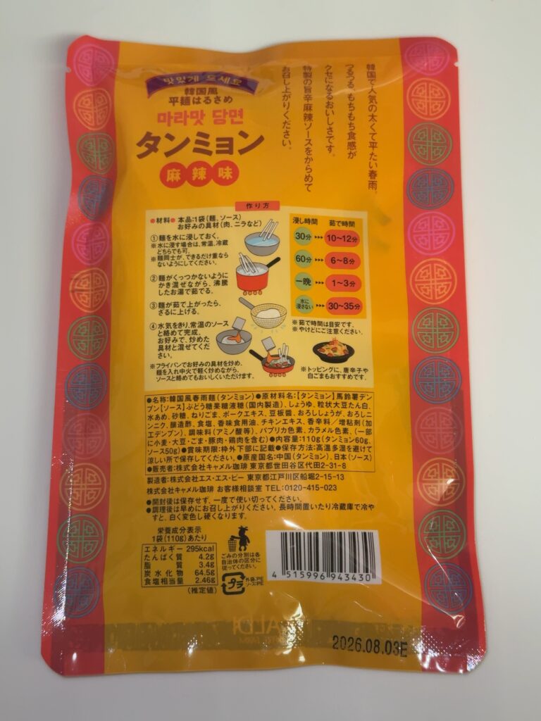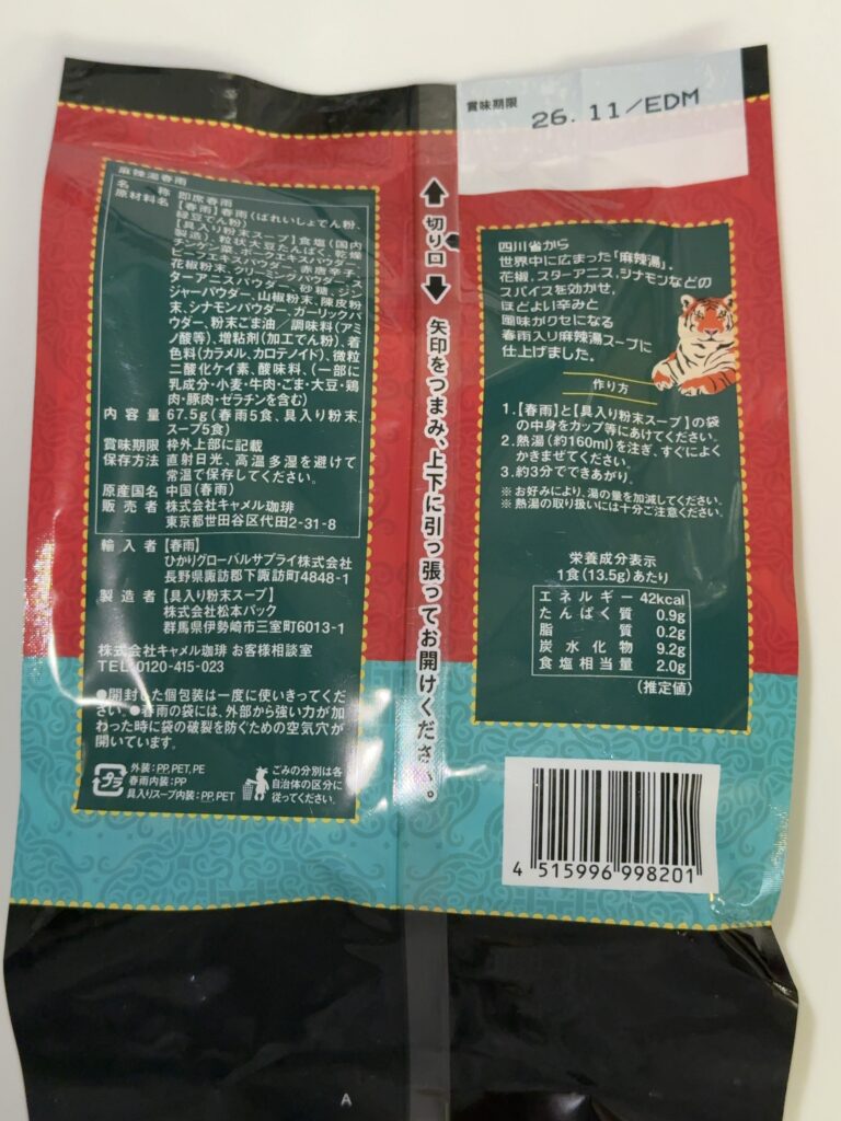 春雨とスープがセットになっていて、お湯を注ぐだけで簡単に麻辣湯が楽しめます。