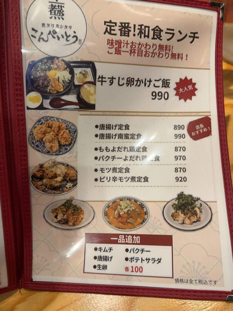飯田橋でランチをするなら、安い価格帯で定食が充実している「煮タリ蒸シタリ こんぺいとう」は、覚えておいて損のないお店だと感じました。