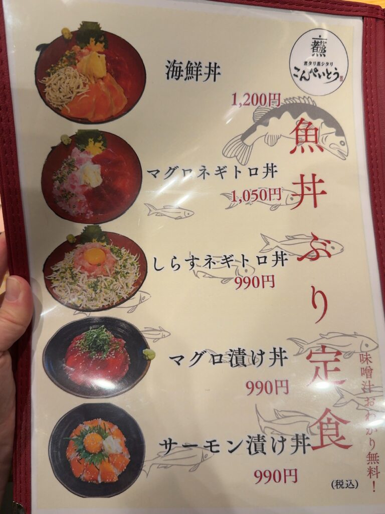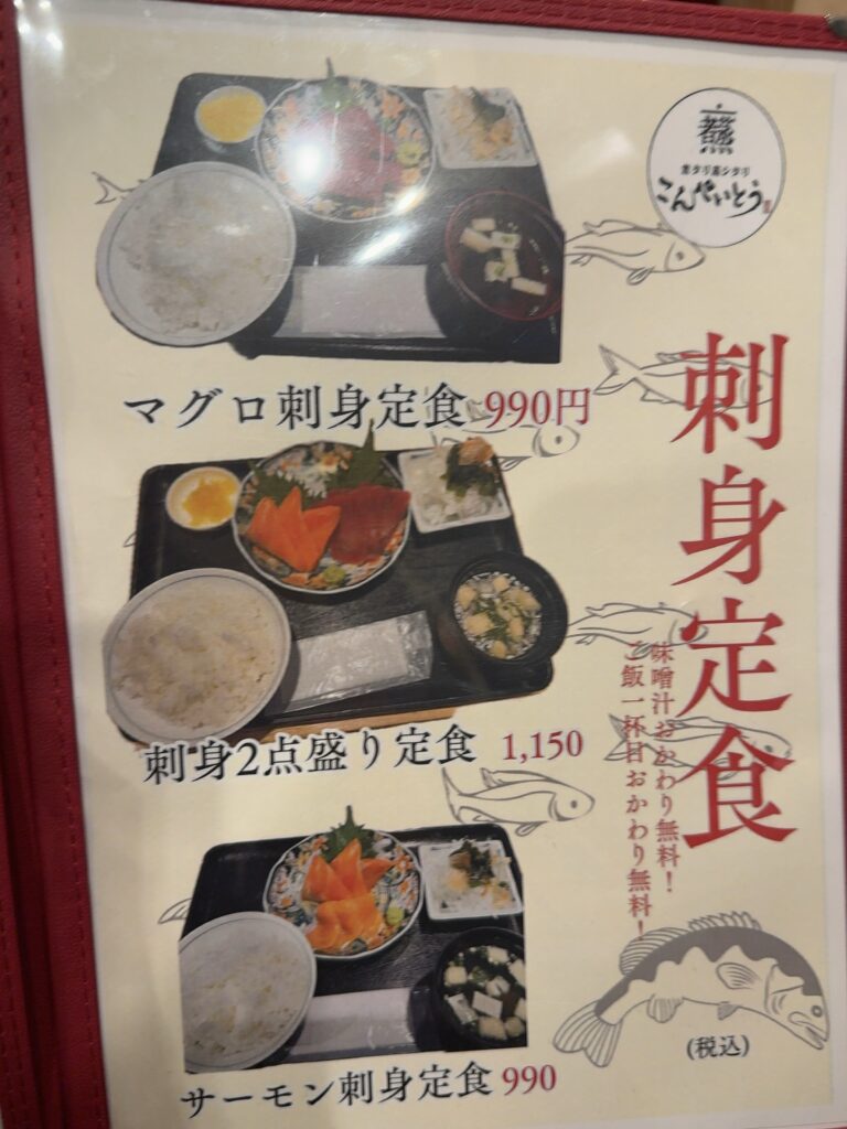 さらに、和食中心の定食メニューが豊富で、刺身定食、魚丼、日替わりランチなども用意されています。