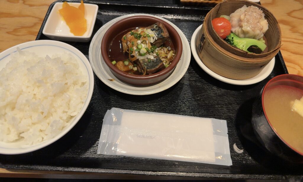 せいろで蒸したシウマイと、煮魚が一緒になった定食で、名前の通り“煮る”と“蒸す”を同時に楽しめる内容でした。