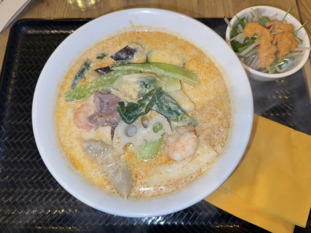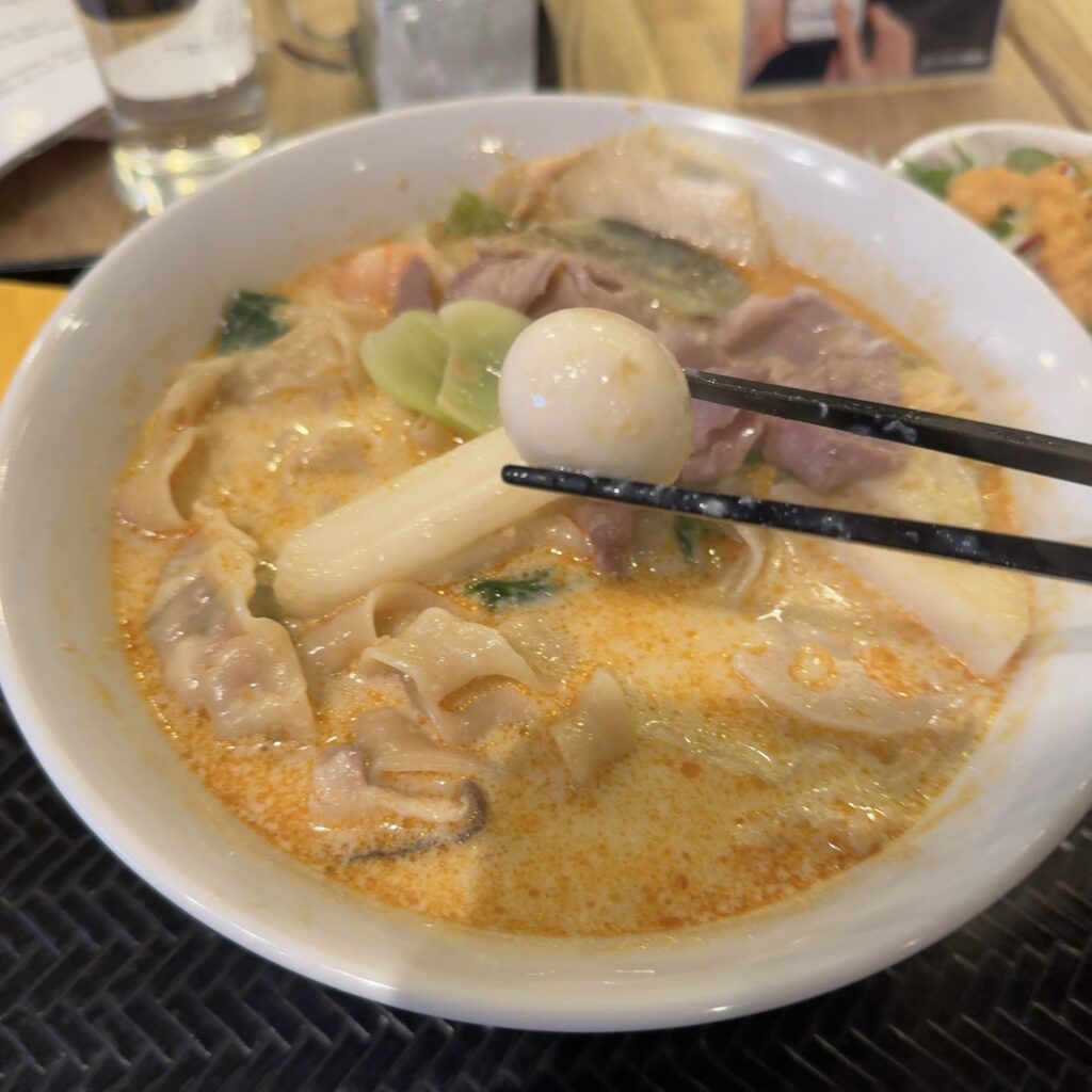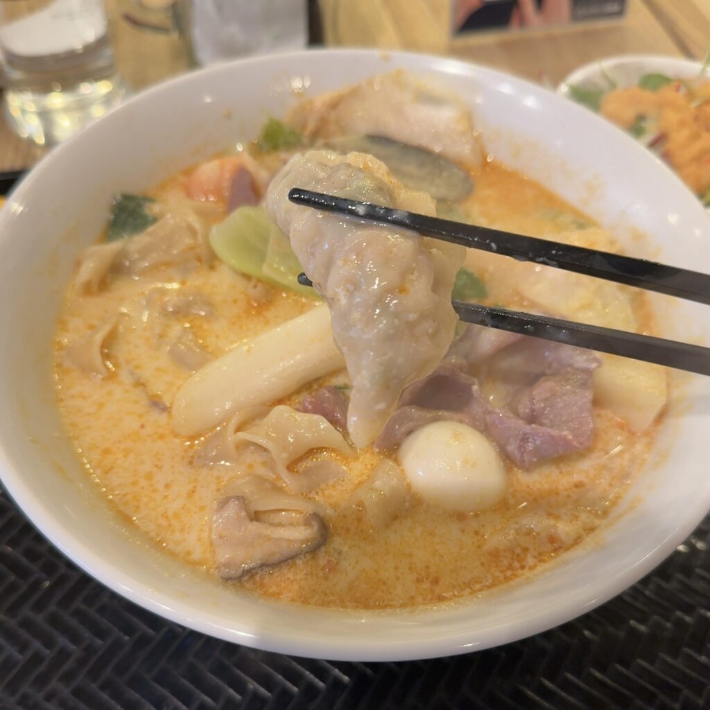 スパイスの効いたピリ辛スープに豆乳のまろやかさが合わさった一杯です。