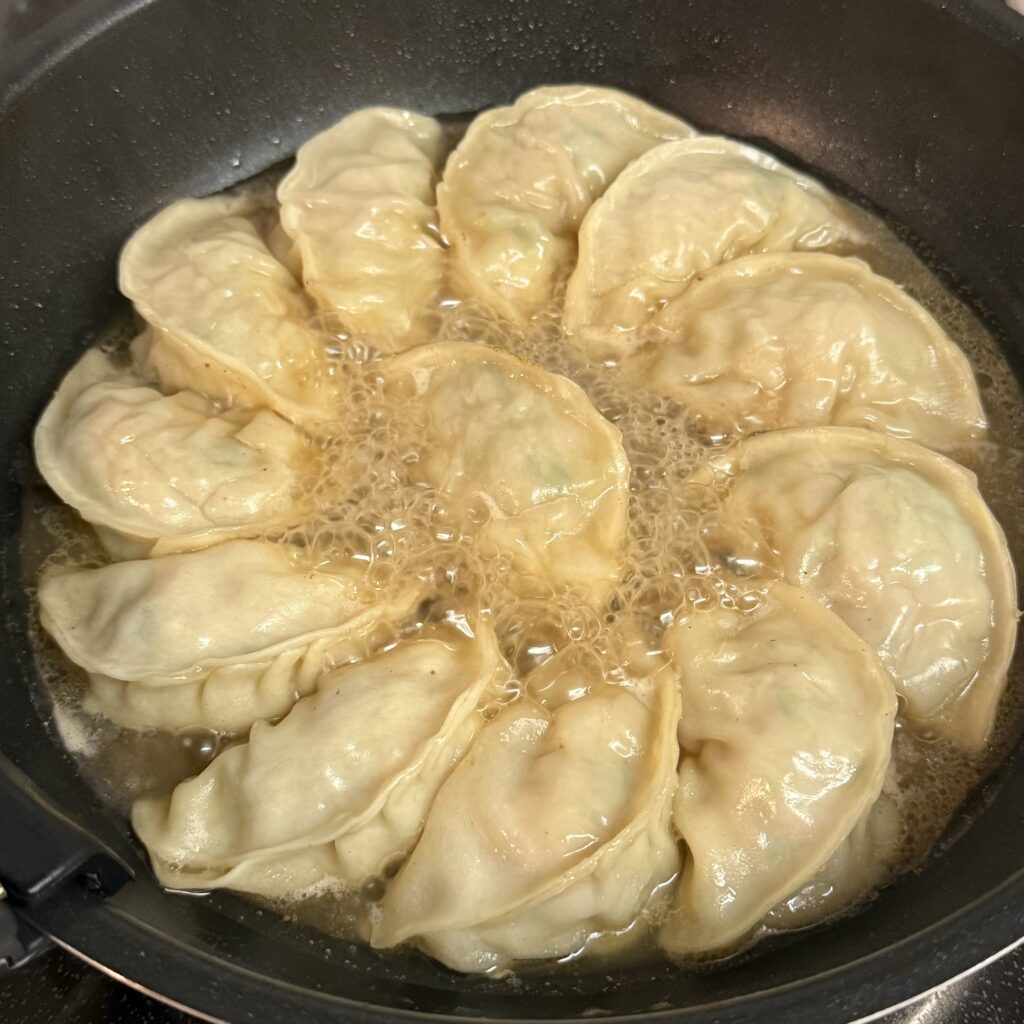 ②焦げ目がついたら、餃子の約1/3程度が浸るくらいのお湯を入れて蓋をする