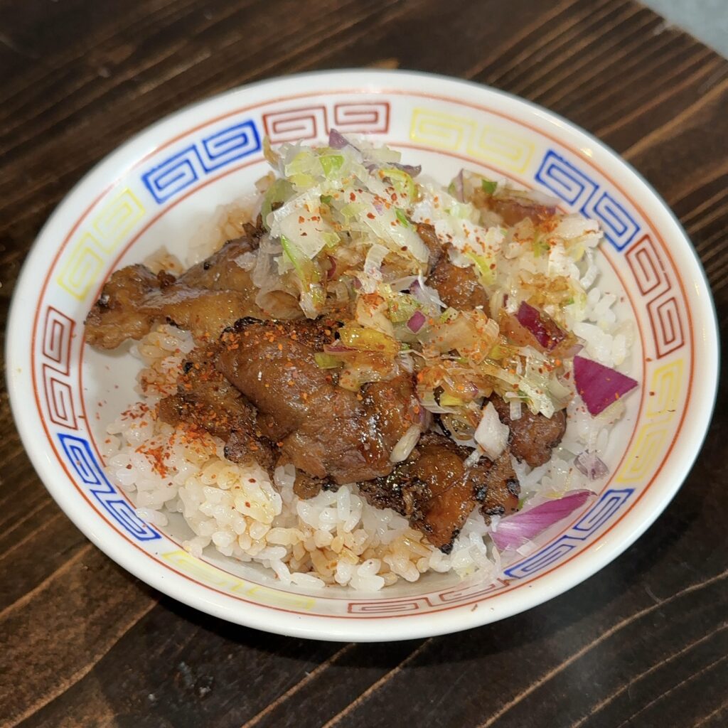 しっかりと味付けされた鶏皮を燻製し、ねぎや玉ねぎも載せた丼です。