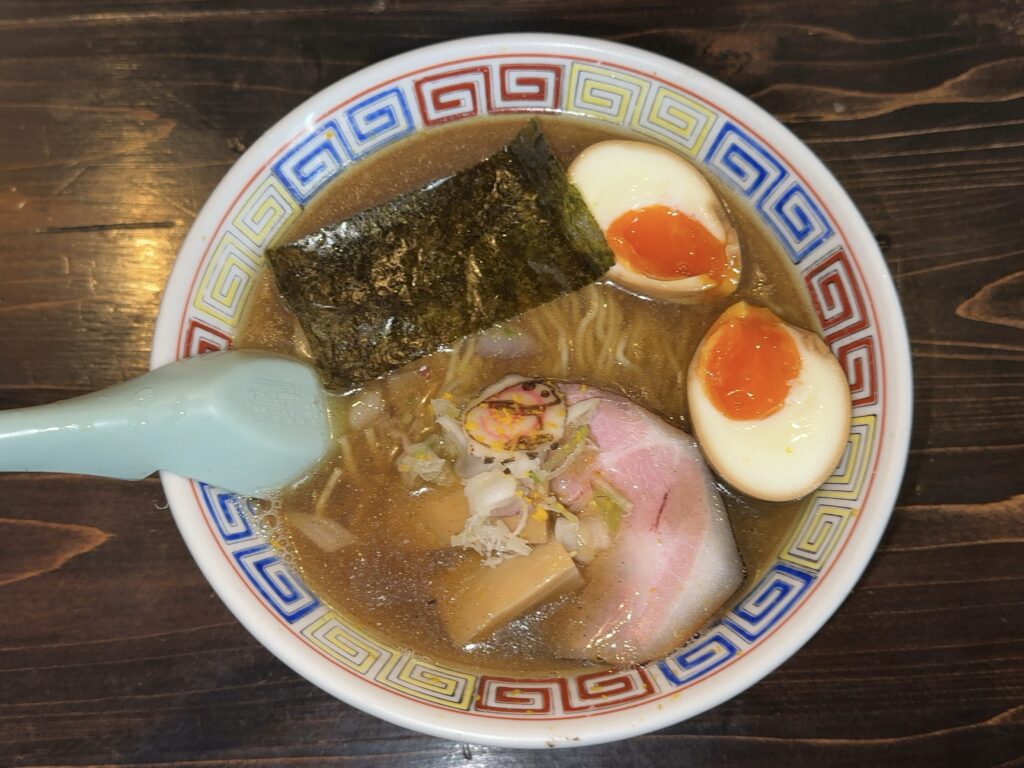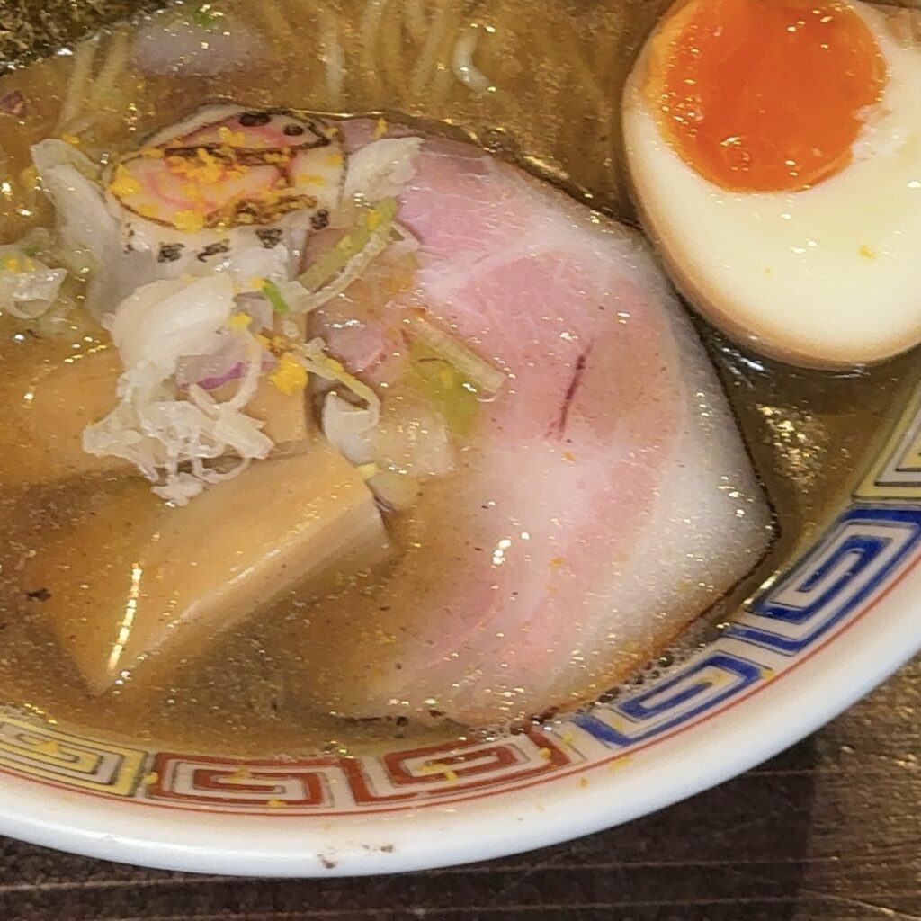 のり、メンマ、玉ねぎとねぎのミックス、そしてチャーシューが乗っており、今回は追加で名物の煮卵もトッピング。