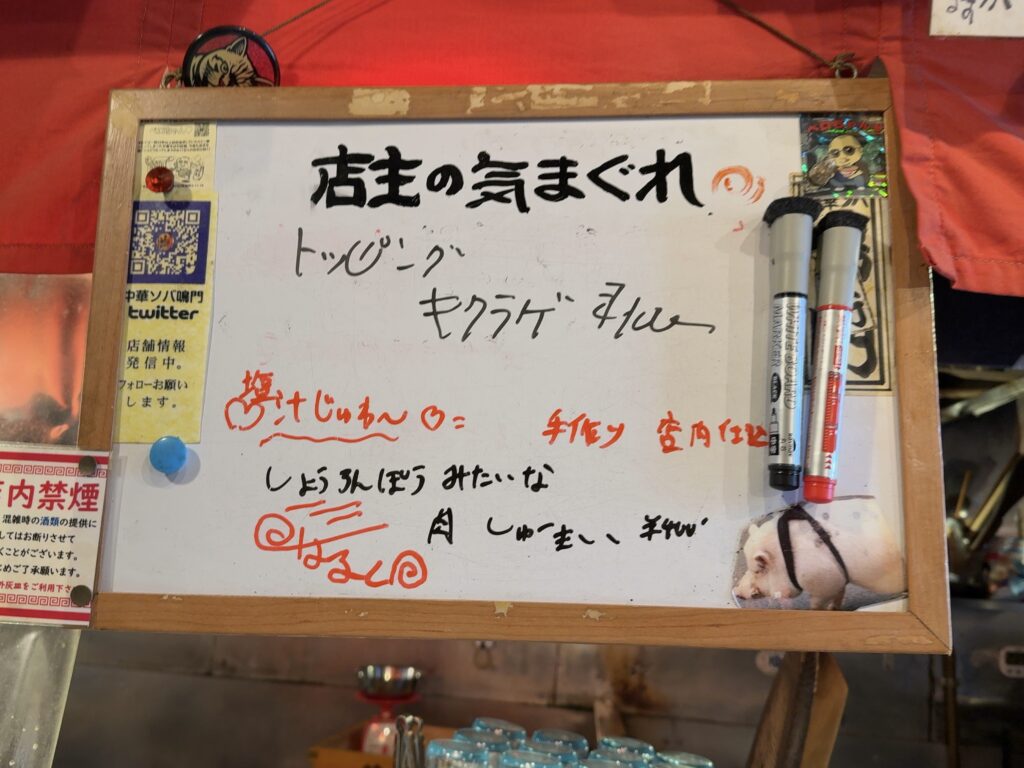 カウンター前のホワイトボードには、店主の気まぐれメニューが書いてあります。