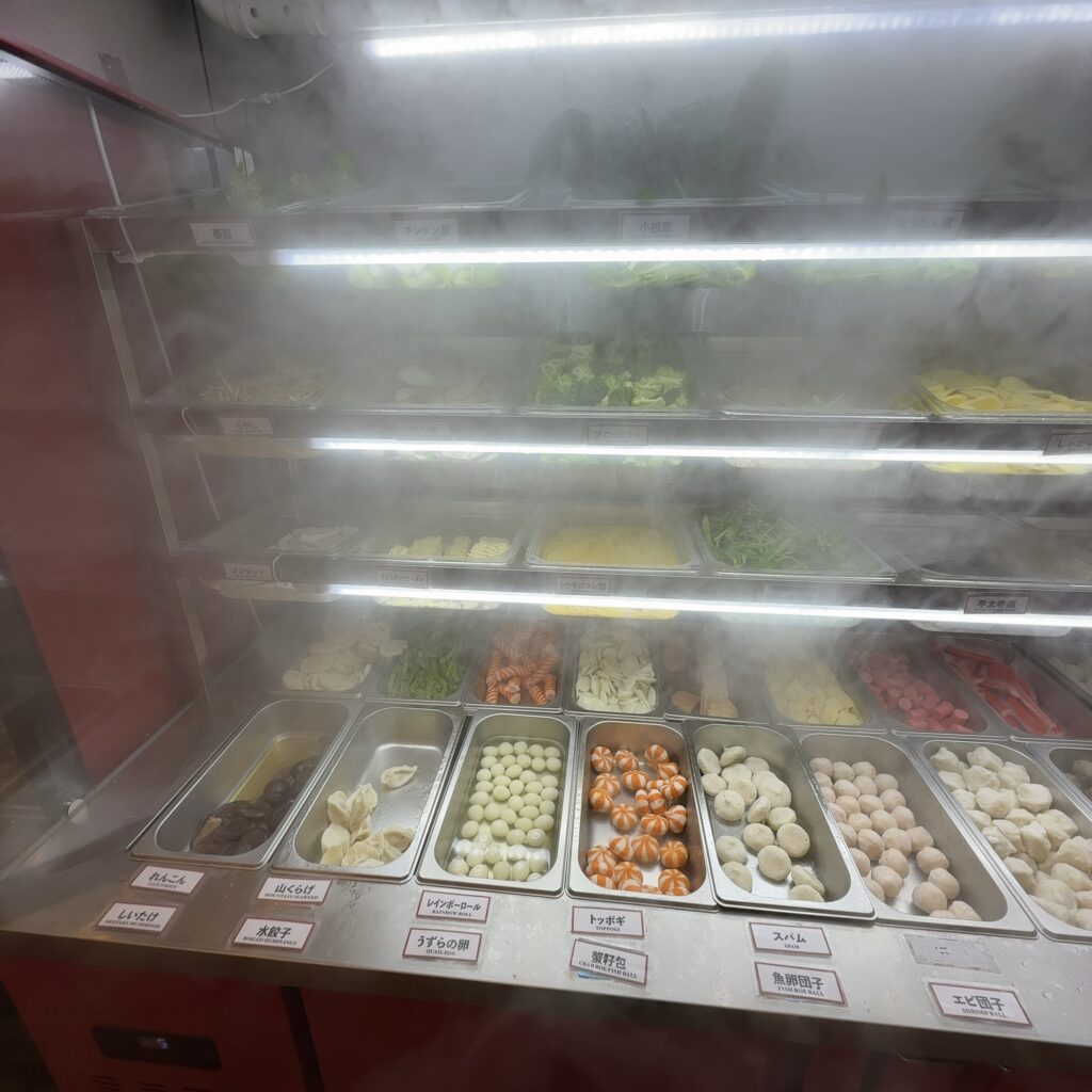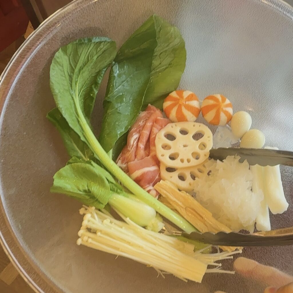 蟹団子、ブンモジャ、小松菜、チンゲン菜、干し湯葉、えのき、うずらの卵、れんこん、白きくらげ、豚肉をトッピング。