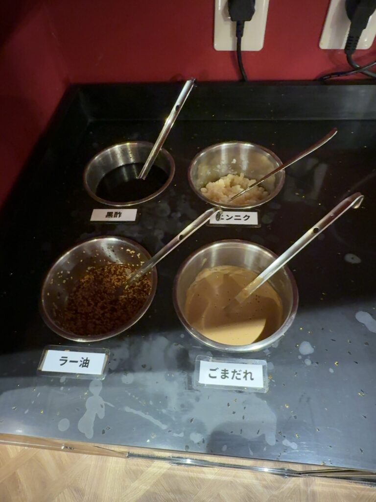 ごまだれ、黒酢、ニンニク、ラー油が味変用の調味料として、お水の横にあります。