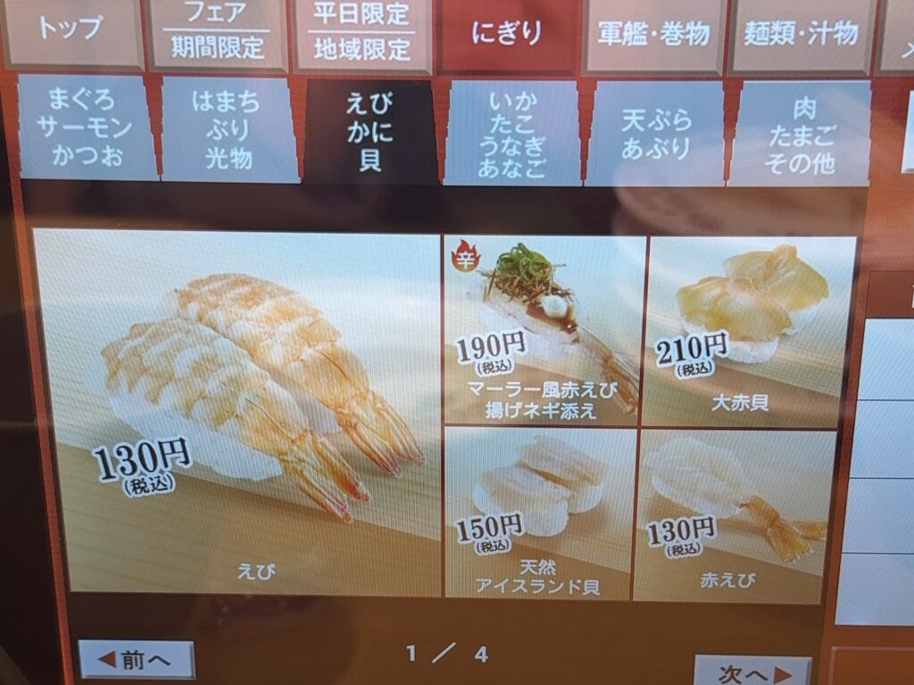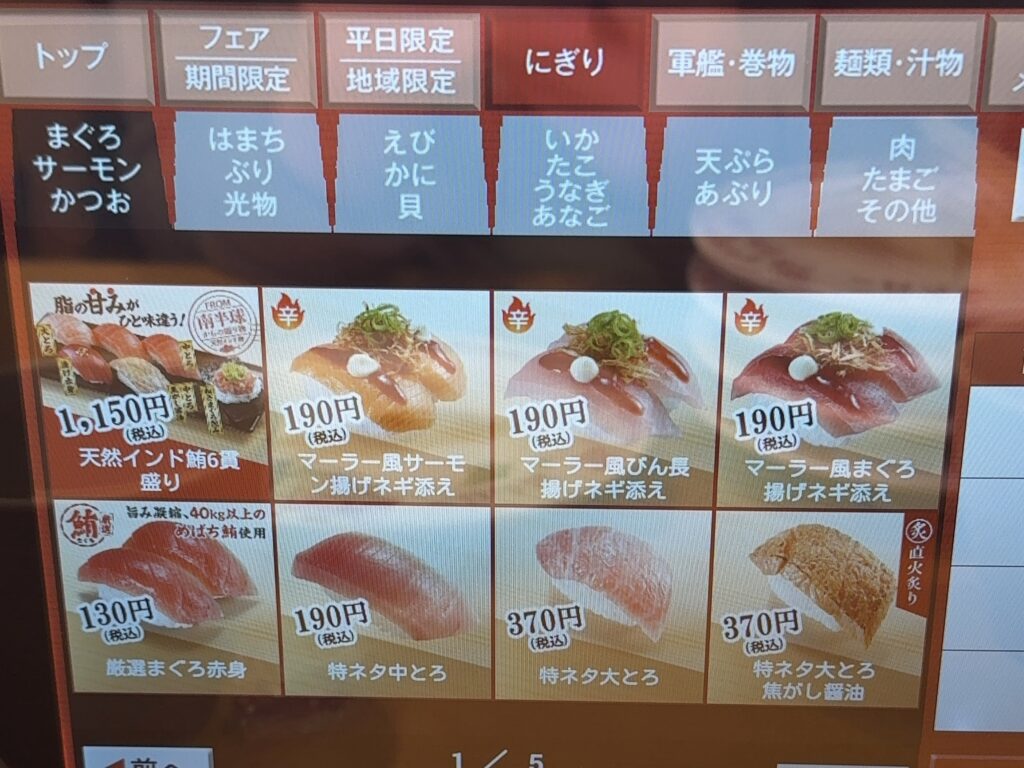 スシローは地域により値段が変わりますが、130円スタートのお店で、130円、190円で販売されていました。
