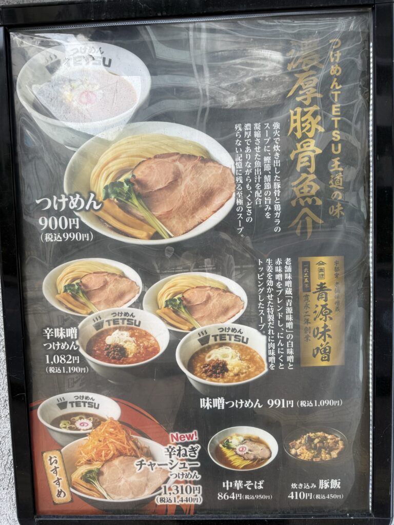 つけめん、辛味噌つけめん、味噌つけめん、辛ねぎチャーシューつけめんと、つけ麺メニューが充実。