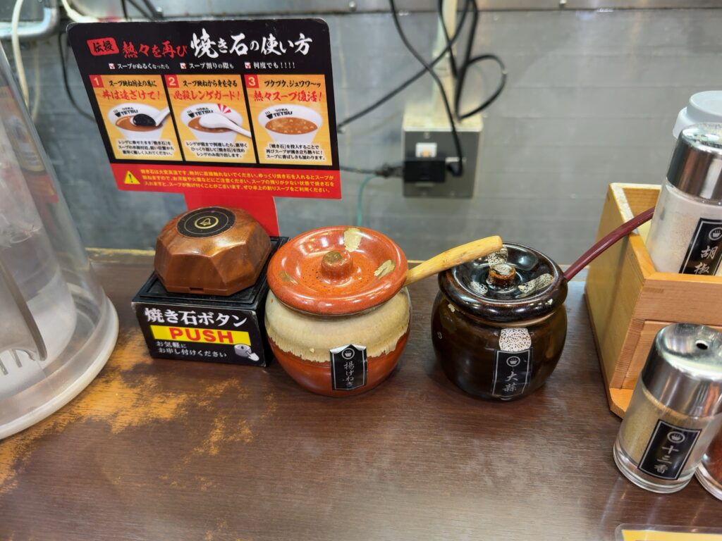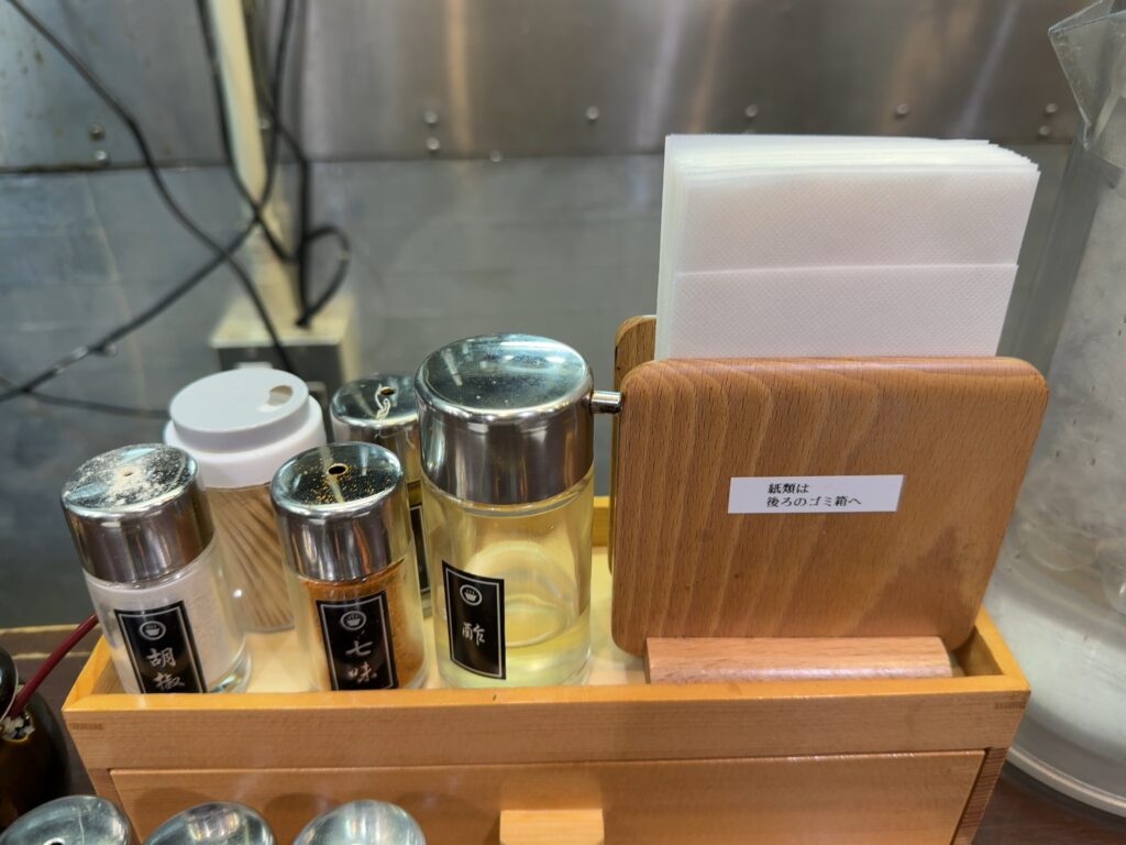 卓上には、揚げねぎやにんにく、酢や七味といったスパイスも充実。