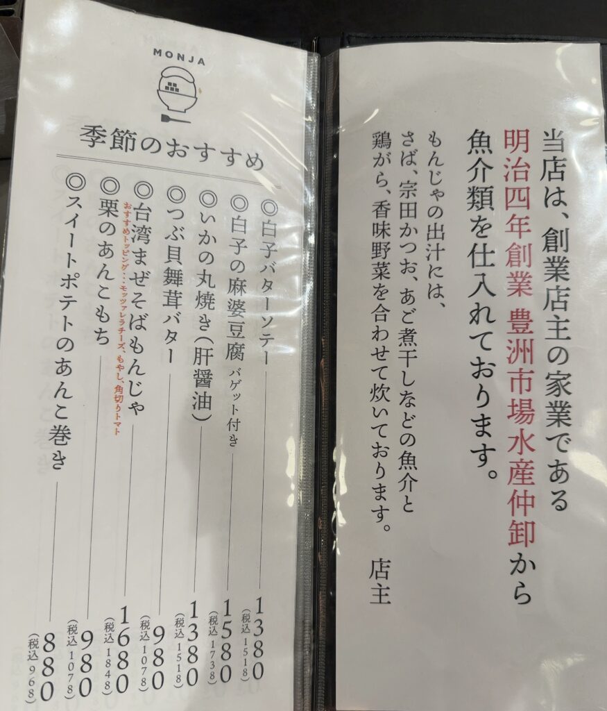 季節のおすすめメニューとして、白子のバターソテー、いかの丸焼きがありました。