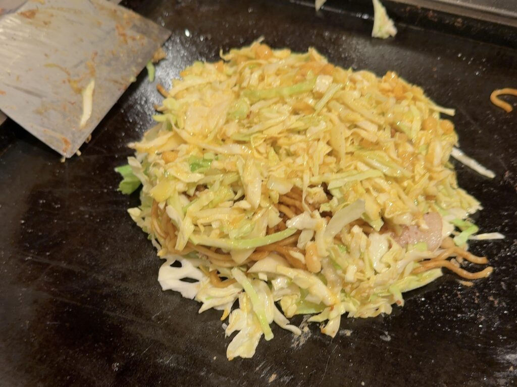 お好み焼き生地で、焼きそば麺と豚肉を挟み、しっかりと焼き目が付くまで両面焼き上げます。