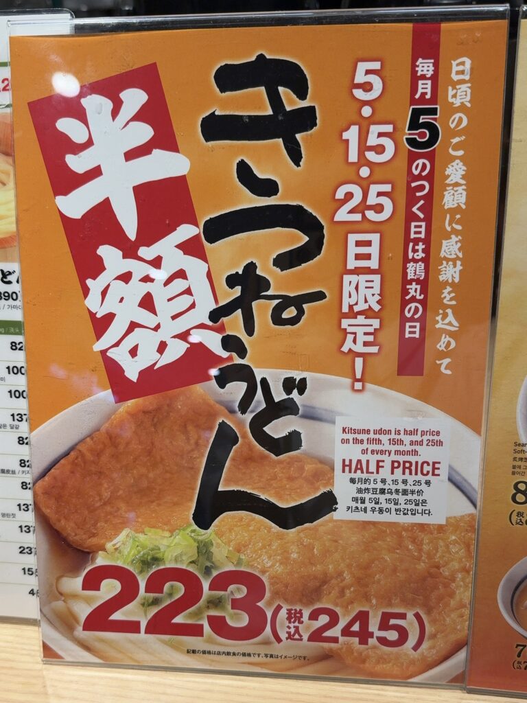 特に「5のつく日のきつねうどん半額(245円)」は見逃せないお得デーです。