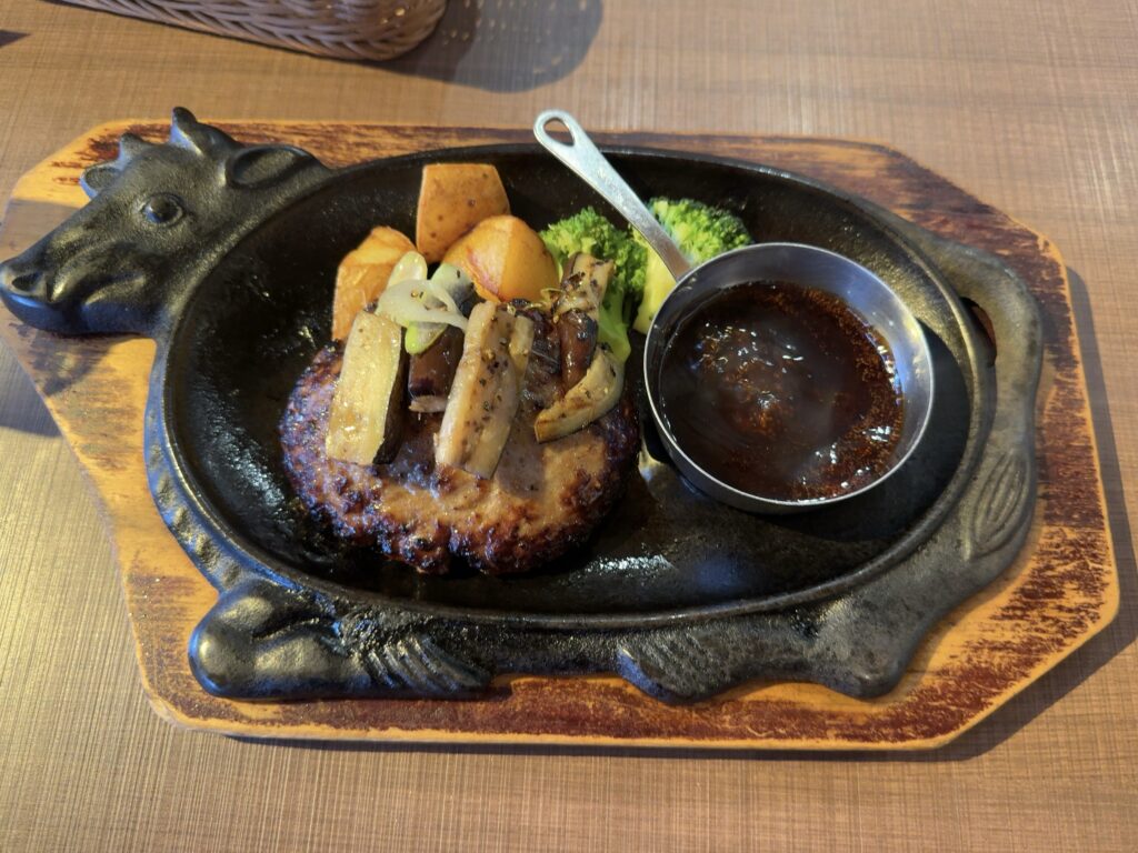 目の前に届いたハンバーグは、鉄板の上でじゅわっと音を立てていて、それだけで期待が高まります。
