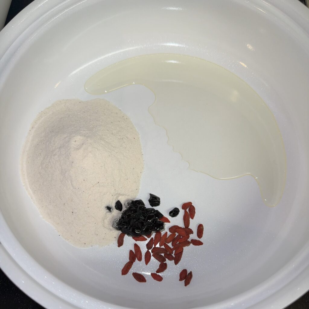 - 鍋に粉末スープ、香味油、クコの実、豆豉を入れる