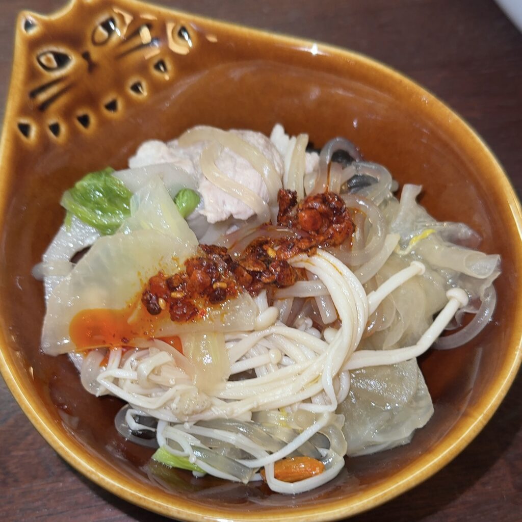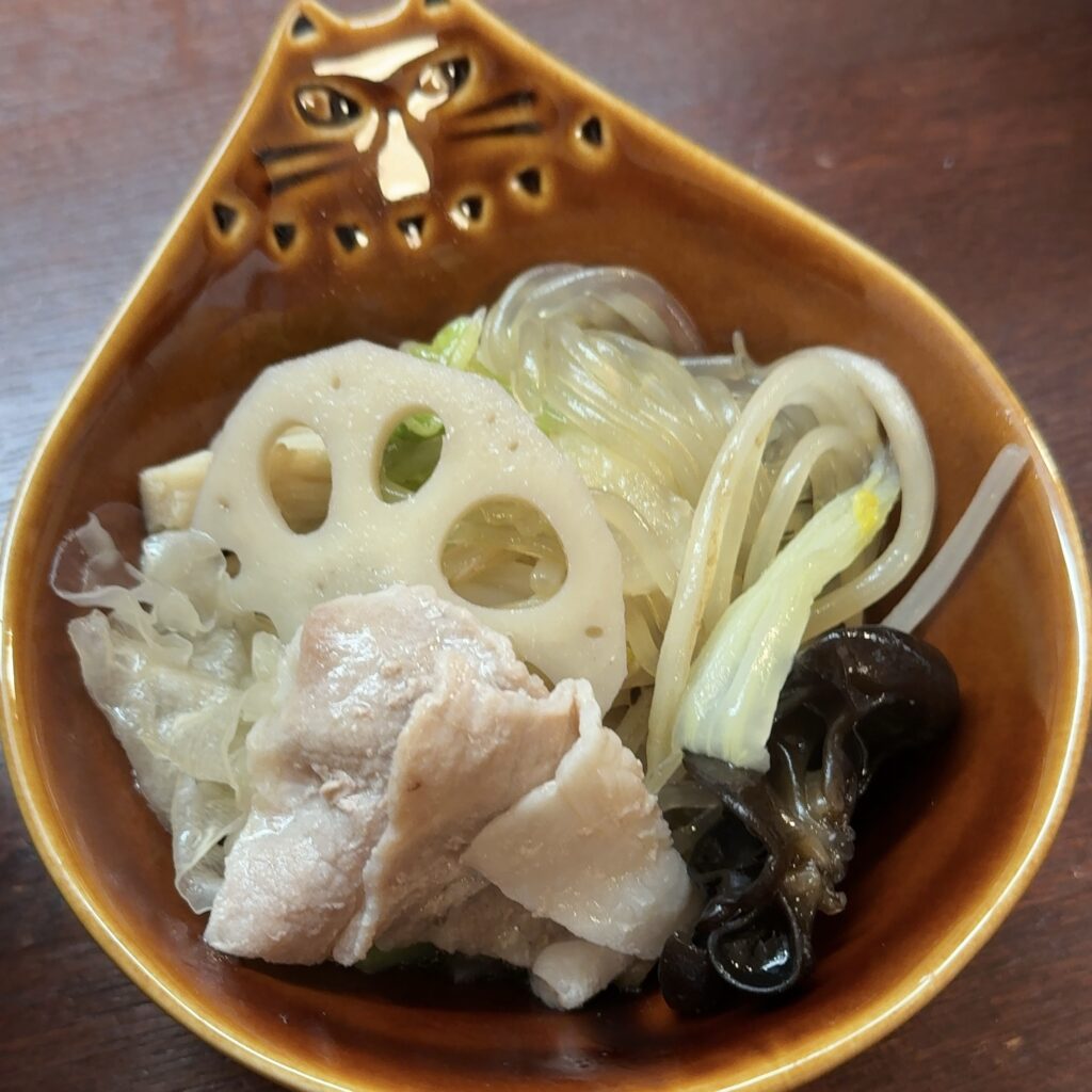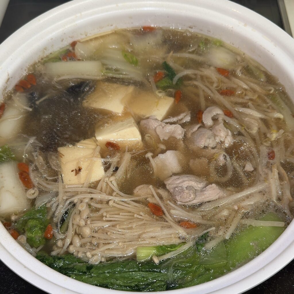 今回は、白菜、もやし、大根、れんこん、チンゲン菜、黒きくらげ、白きくらげ、えのき、豆腐、豚肉、さつまいも春雨を選びました。
