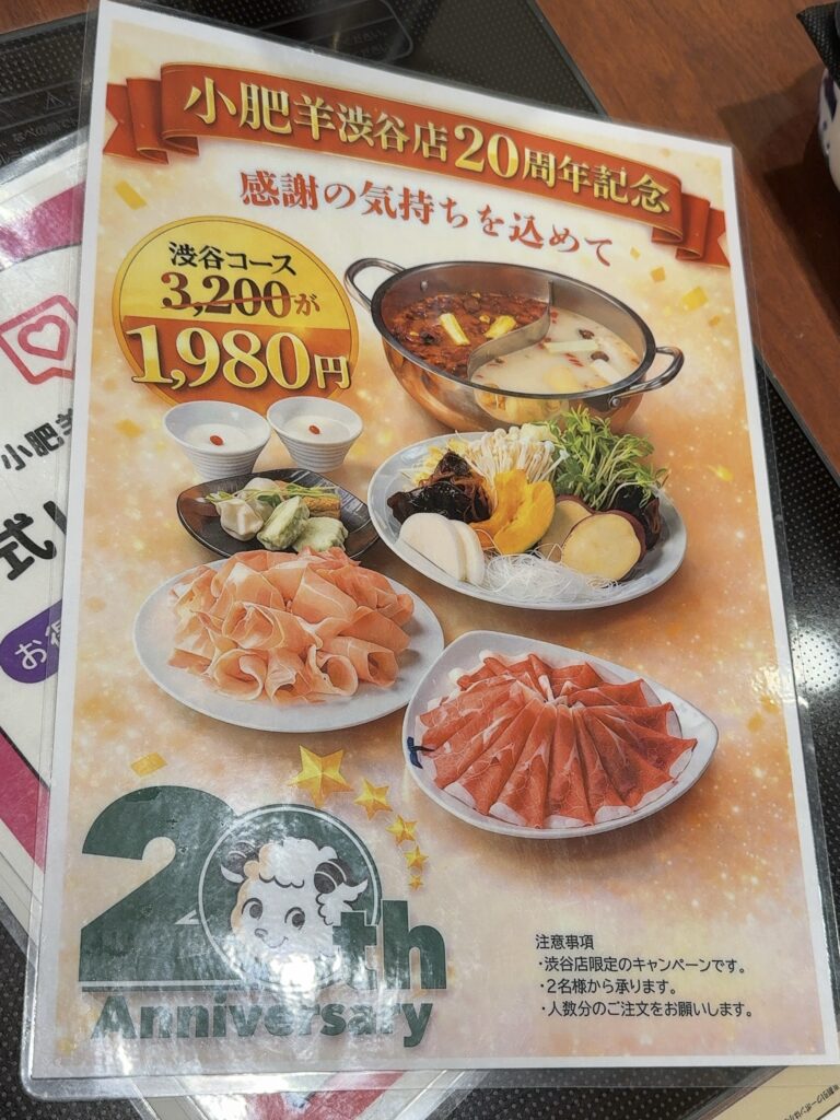 今回は、小肥羊 渋谷店の20周年記念企画で「渋谷コース」が1,980円だったので実際に食べてきました。