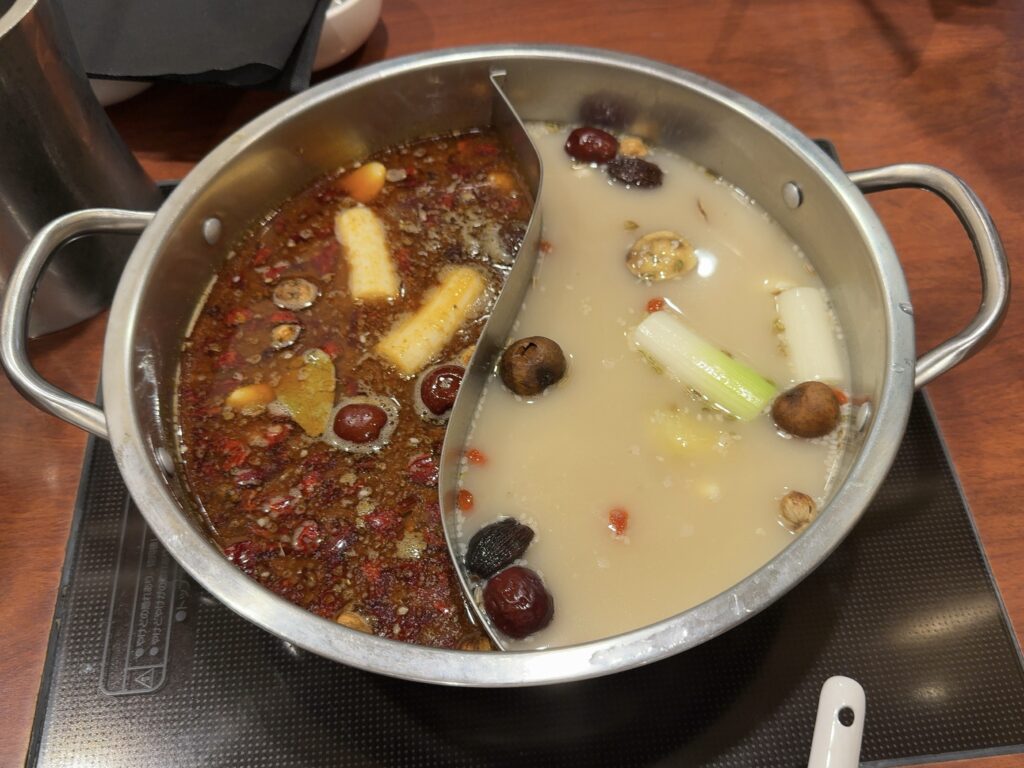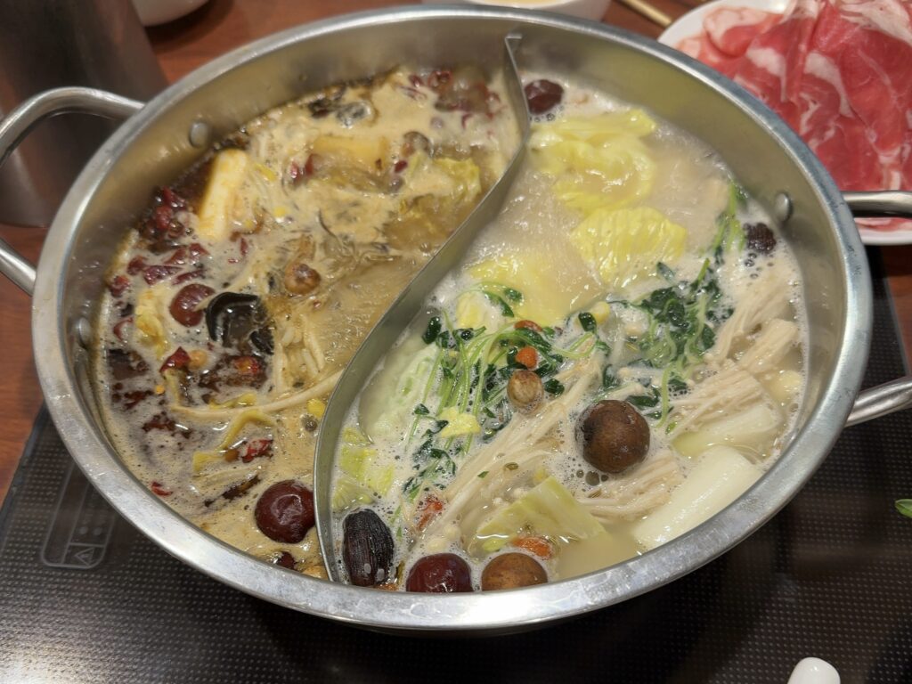スープは2色鍋で、白湯スープと麻辣スープを同時に楽しめます。