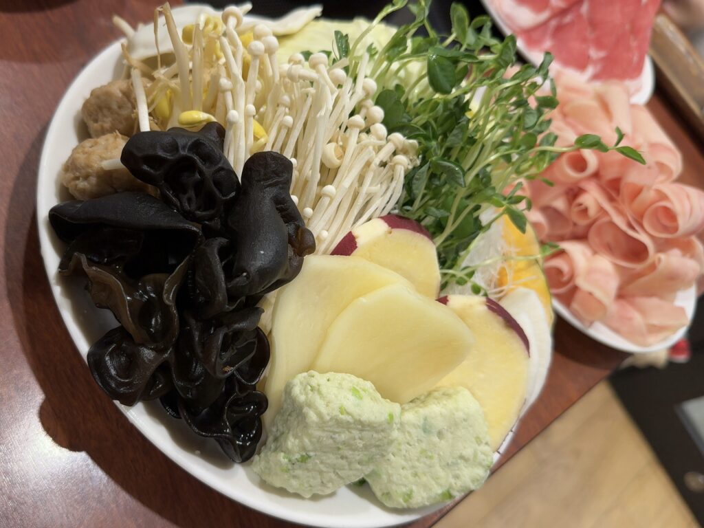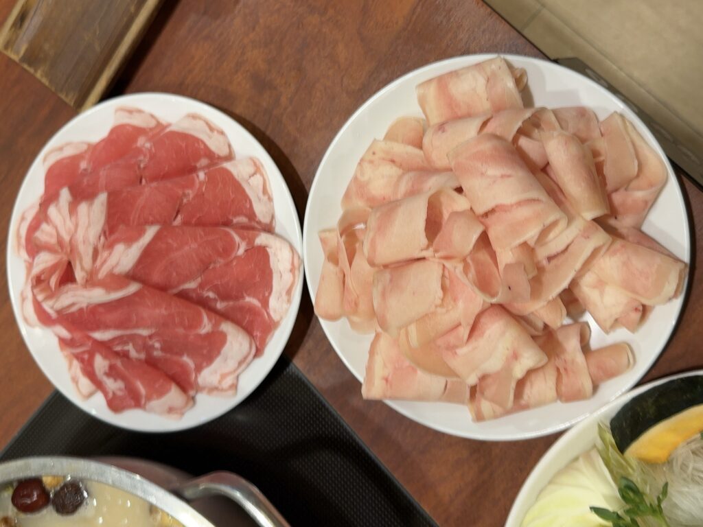 どちらも薄切りなので、火鍋のスープにくぐらせる時間はほんの数秒。ラム肉はクセが出にくく、鶏もも肉はふんわりとした食感で、火鍋が初めての方でも食べやすいと感じました。