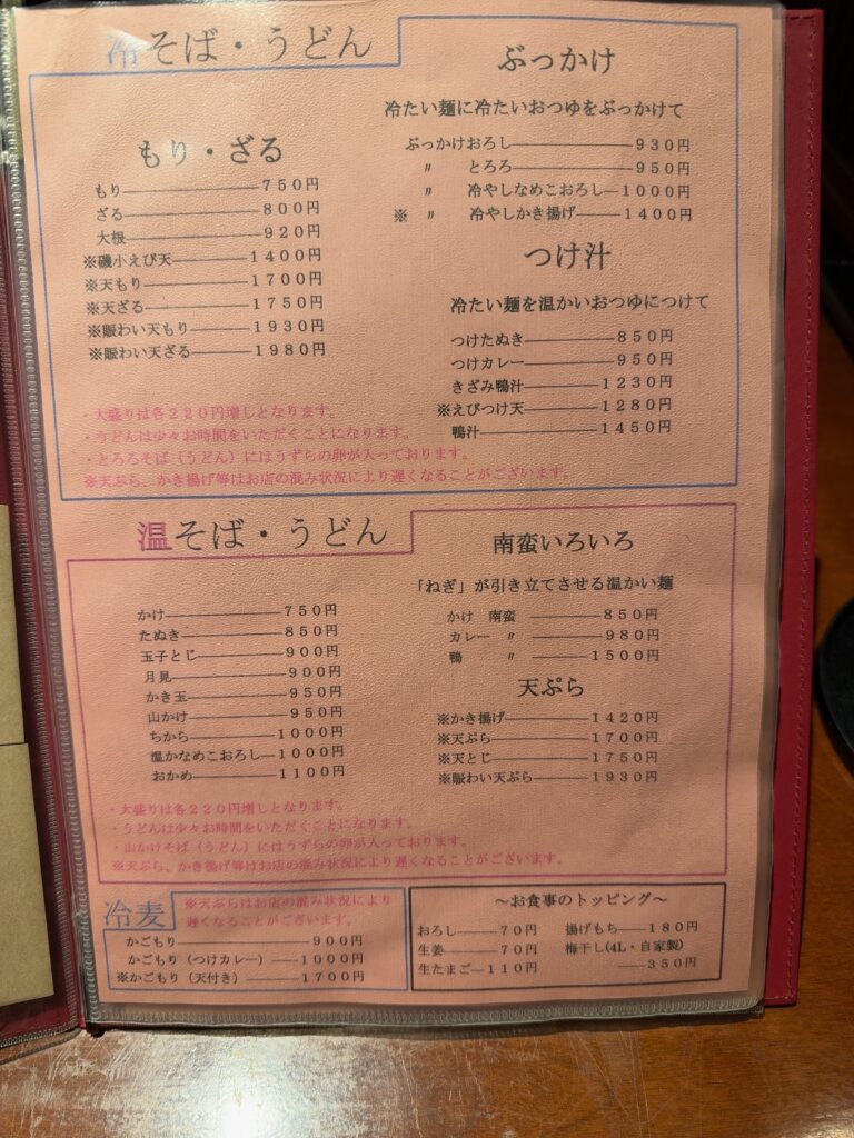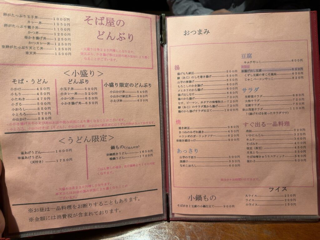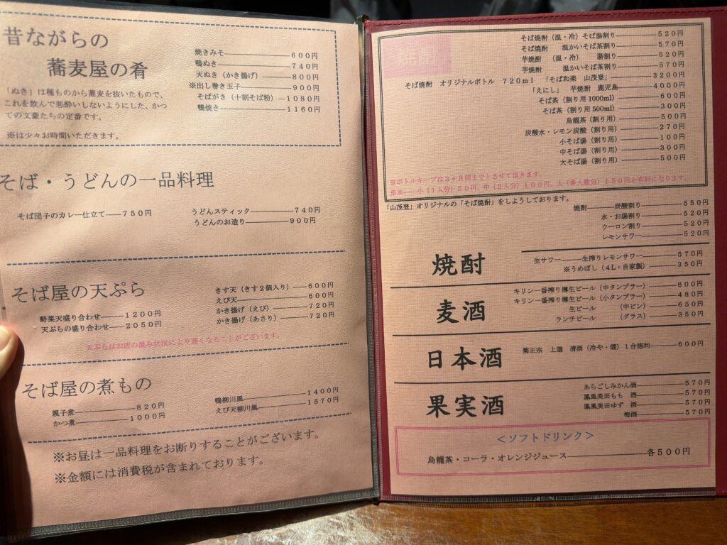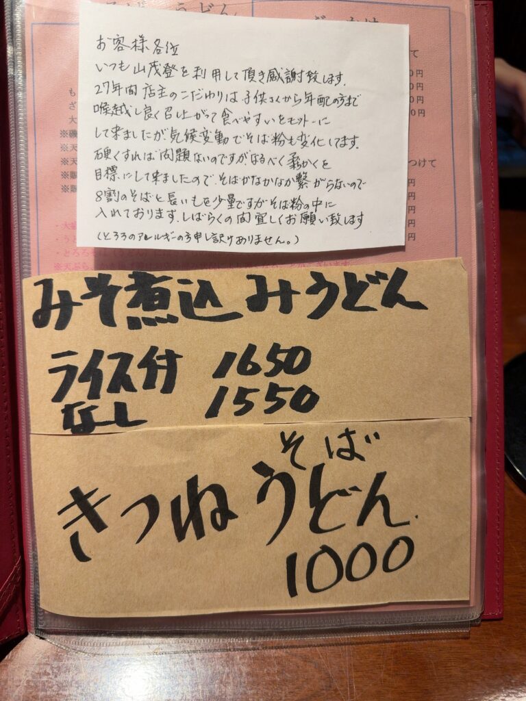 メニュー1ページ目に、そばには少量の長いもが含まれている旨の記載があり、アレルギーに配慮されている点も印象的でした。