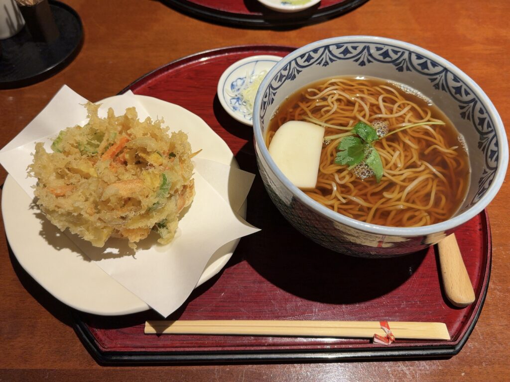 同行者が選んだのは、温そばとかき揚げの組み合わせ。